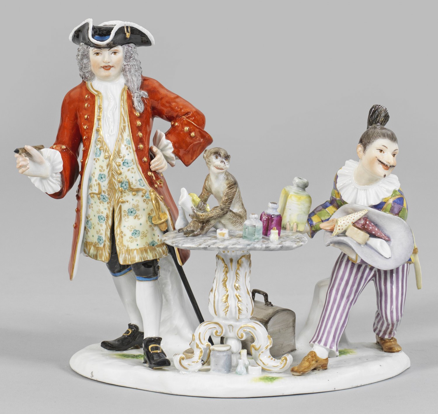 Zahnarzt mit Affen und Harlekin Auf Grassockel ein Arzt oder Marktschreier in vornehmer Kleidung mit Degen und Schreibstift, neben einem Tischchen stehend, auf dem sich ein Affe an Medikamenten zu schaffen macht, während ein Harlekin Tüten mit Kräutern herbeibringt. Kaendler beschrieb die Gruppe in seiner Taxa: "Zahn-Arzt mit einer großen Peruque oder Marckt-Schreyer, seine Medicamente ausbiethend, hat neben sich eine Tisch stehen, darauff Medicamente liegen, u. einen Affen, welcher Arzney hält, wie auch ein Arlequin in lustiger Positut, in seinem Huthe Kräuter habend." Polychrome Malerei mit Gold. Entw. Johann Joachim Kaendler. Modell-Nr. 1886. Minim. rest.; Schwertermarke. H. 19,5 cm, B. 23 cm.