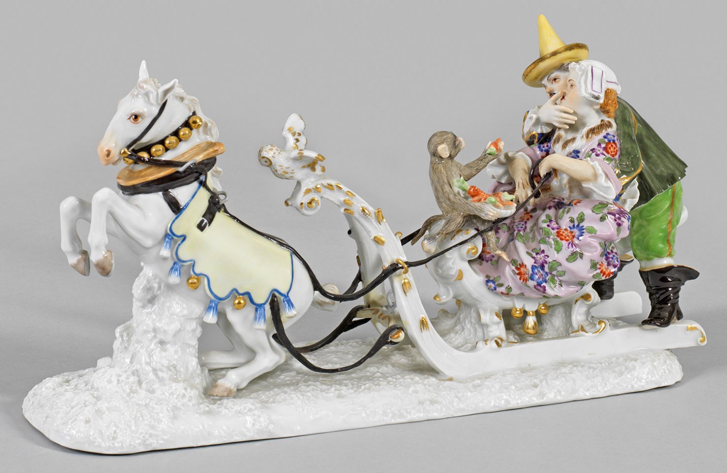 Figurengruppe "Schlittenfahrt" Auf länglichem Sockel steigendes Pferd mit Schellendecke, im Schlitten sitzend der als Dame verkleidete Hofnarr Gottfried Schmiedel, dahinter sein Mitstreiter Joseph Fröhlich mit Spitzhut. Vor dem Paar sitzender Affe. Entw. Johann Joachim Kaendler um 1735. Polychrome Malerei mit Goldstaffage. Minim. rest.; Schwertermarke. H. 15,5 cm. L. 31,5 cm.