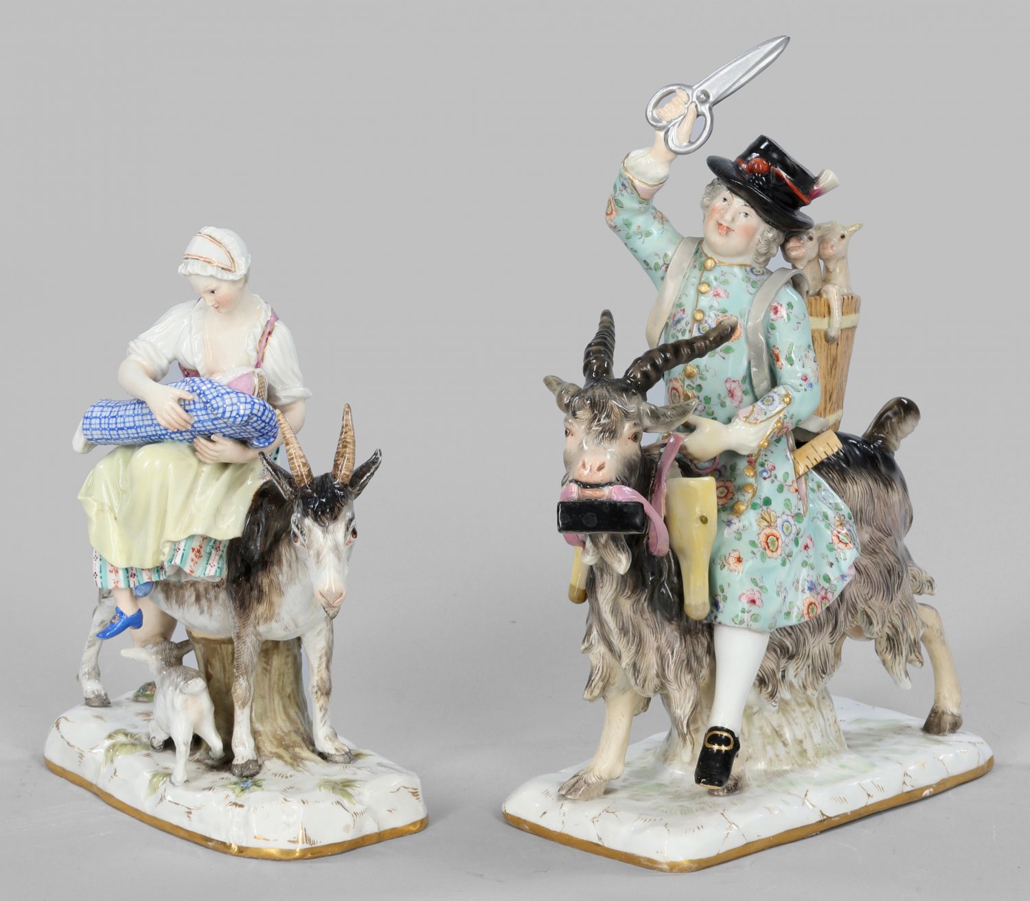 "Schneider" und "Schneiderin" Gegenstücke. Auf einem Ziegenbock sitzender Schneider, eine große Schere hochhaltend. Auf dem Rücken eine Kiepe mit zwei Zicklein. Im Maul des Ziegenbocks hängendes Bügeleisen. Als Gegenstück junge Schneiderin auf einer Geiß sitzend, ihr Kind im Steckkissen, mit beiden Händen haltend. Polychrome Malerei mit Goldkonturierung. Entw. Johann Joachim Kaendler und Johann Friedrich Eberlein. Modell-Nr. 155 und 171. Rest.; Schwertermarke. H. 18 cm - 23,5 cm.