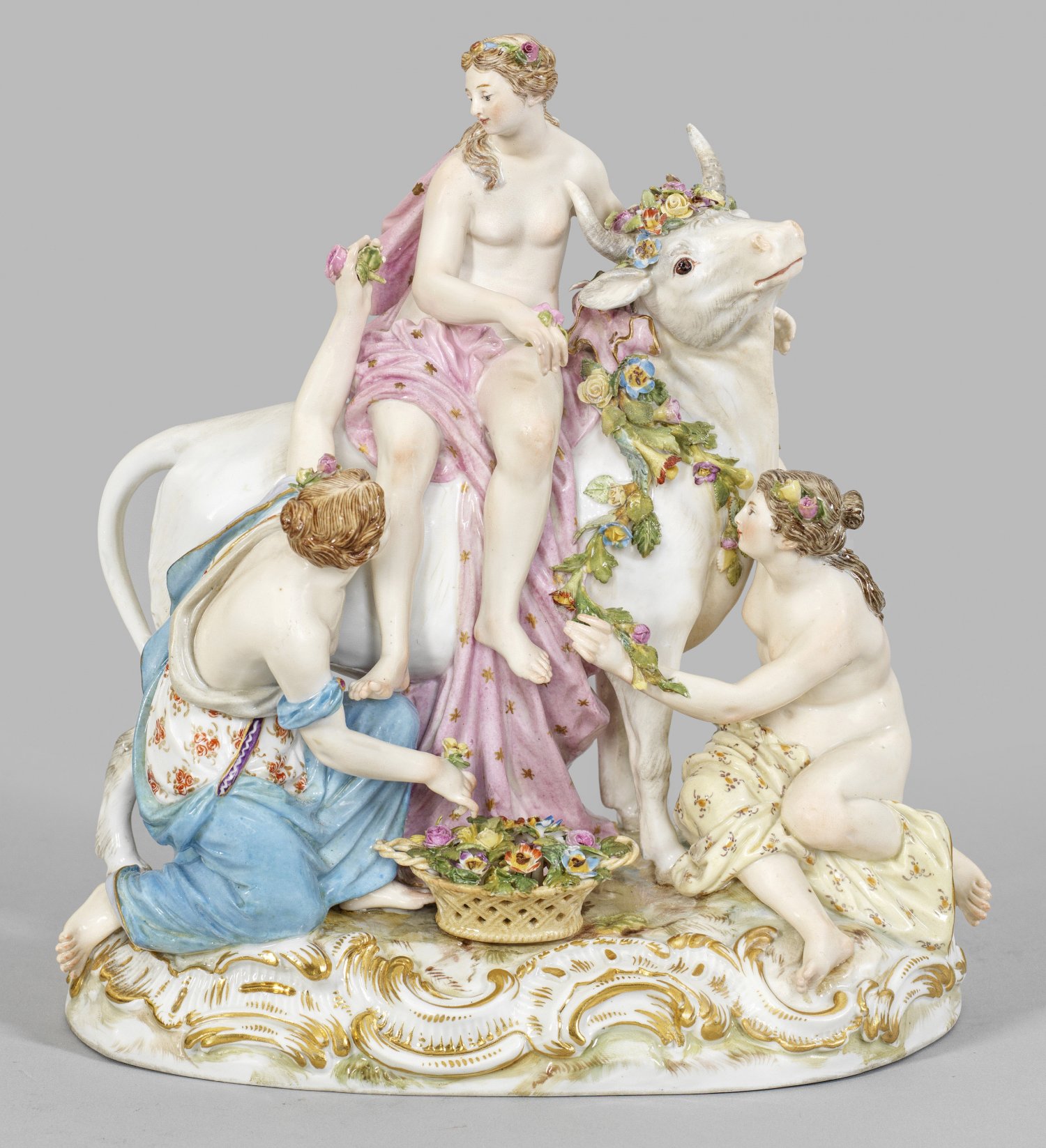 Figurengruppe "Europa auf dem Stier". Originaltitel Über rocaillereliefiertem, naturalistisch staffiertem Sockel, auf einem, mit einer Blumengirlande geschmückten Stier sitzende Europa. Zu ihren Füßen zwei kniende Nymphen mit Blumenkorb. Polychrome Malerei mit Goldstaffage. Entw. Johann Joachim Kaendler. Modell-Nr. 2697. Rest.; Schwertermarke. H. 21 cm.