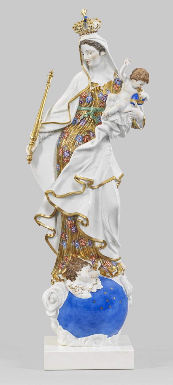Madonna mit dem Christuskind auf quadratischer, weiß lackierter Holzplinthe montiert. Auf einer Himmelskugel und reliefplastisch gestalteter Wolkenbank mit Cherub stehende Gottesmutter in langem, reich mit Indianischen Blüten gemustertem, goldgrundigem Kleid als Himmelskönigin mit Zepter in der rechten Hand und Krone auf dem Haupt. Auf ihrem linken Arm das Christuskind haltend, dass einen Reichsapfel trägt. Feine polychrome Malerei mit Goldstaffage. Entw. Gottlieb Kirchner, überarbeitet von Johann Joachim Kaendler 1732. Schwertermarke. Figuren-H. 70 cm.