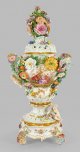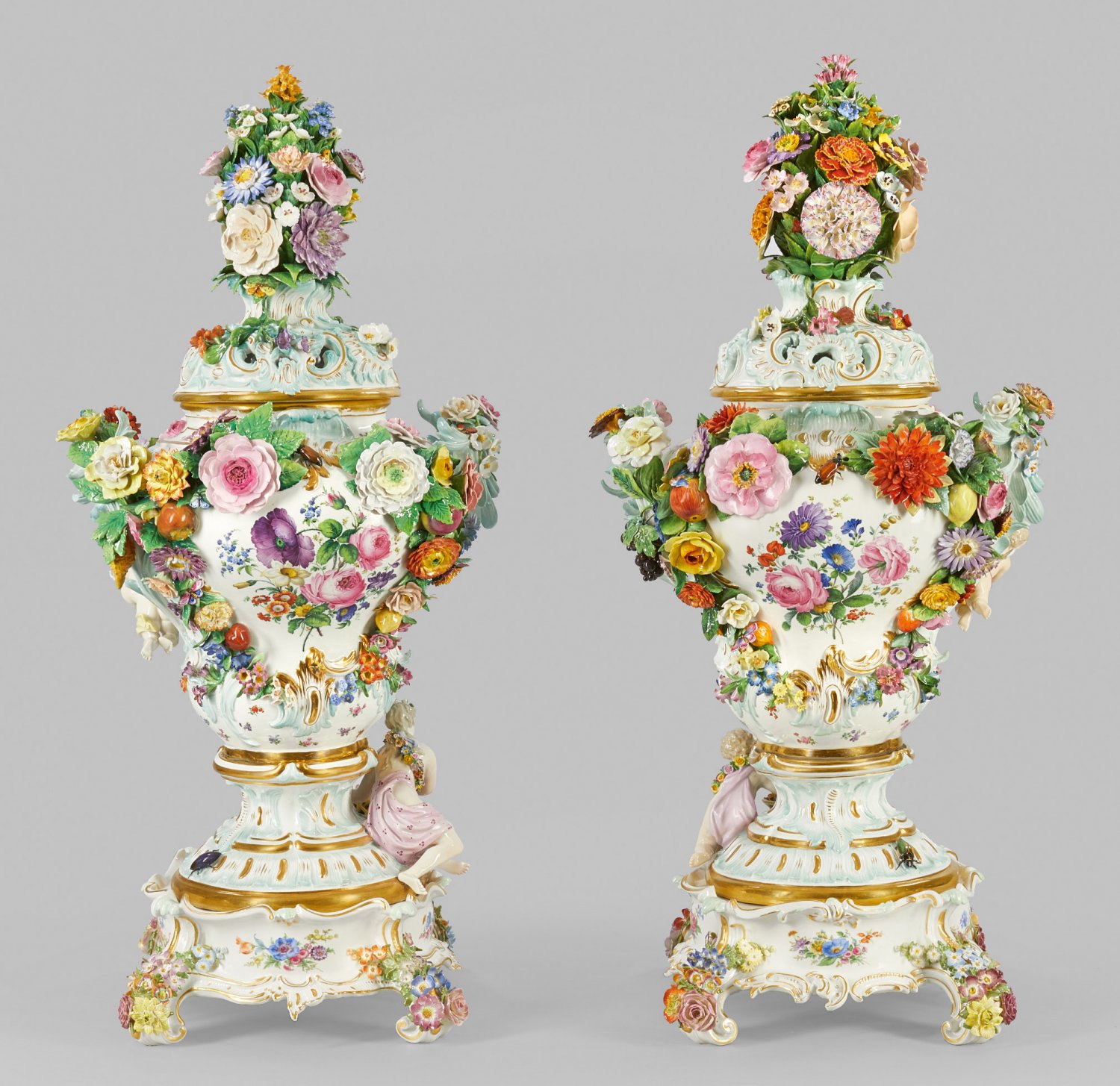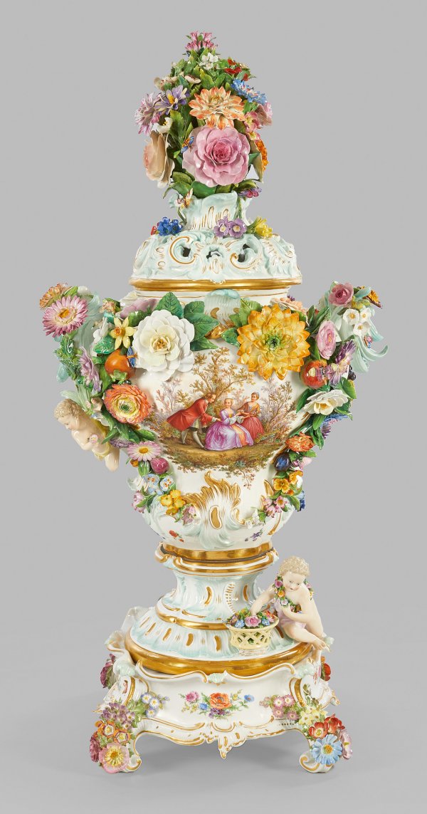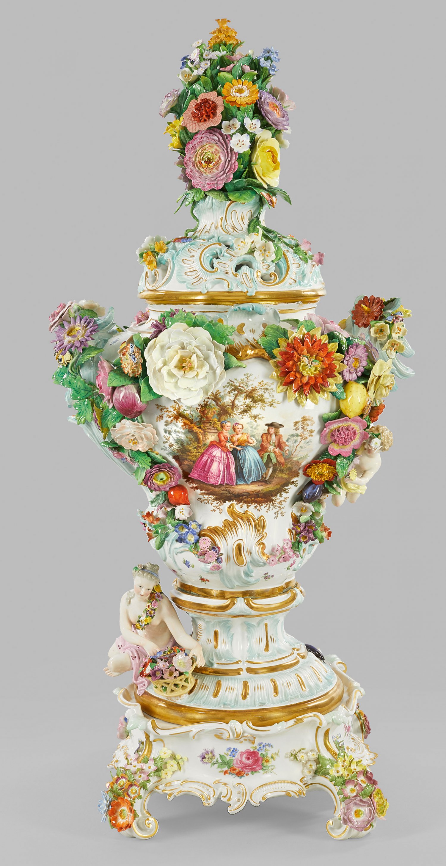 auf quadratischem, von eingerollten Volutenfüßen getragenem Sockel. Über getrepptem, rocaillereliefiertem Rundfuß balusterförmiger, stark vorwölbender Vasenkorpus mit gerundeter Schulter und profiliertem Rand. Gehöhter, von Rocaillereliefs umzogener, durchbrochen gearbeiteter Deckel, in reliefplastische Blätter übergehend, als Basis für ein prächtiges Blumenbukett aus verschiedenen, äußerst feinplastisch modellierten, geöffneten Blüten. Seitlich reliefplastisch aufsteigende Palmblätter als Handhaben. Feinplastisch modellierter, aufgelegter Dekor mit üppigen Festonen aus sommerlichen Blüten und Früchten sowie Insekten. Unterhalb sitzende Flora bzw. Amorette mit gefülltem Blumenkorb und Girlande. Oberhalb jeweils schwebende Amorette. Beidseitig der Wandung, zwischen farbigem Streublumendekor angelegte, großflächige, szenische Darstellung in der Art von Antoine Watteau mit zwei vornehmen, jungen Damen in Gesellschaft eines Kavaliers in grüner, teilw. architekturbestandener Parklandschaft bzw. farbenfrohes Blumenarragement. Feine, polychrome Malerei mit reicher Goldstaffage. Entw. Johann Joachim Kaendler. Minim. best.; Fachgerecht rest.; Schwertermarke. Ges.-H. 89 cm.