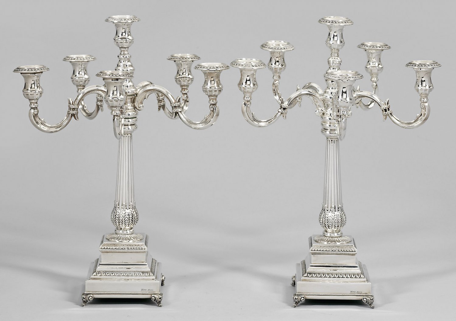 Paar Girandolen im Empirestil Silber. 6-flg.; Hoher, von unterschiedlichen Ornamentfriesen gegliederter, getreppt ansteigender Stand, beschwert. Oberhalb kannelierter Schaft, in vasenförmiger Tülle endend. Davon ausgehend fünf geschweifte Leuchterarme mit korrespondierenden Tüllen. Gest. 925. H. 42,5 cm.
