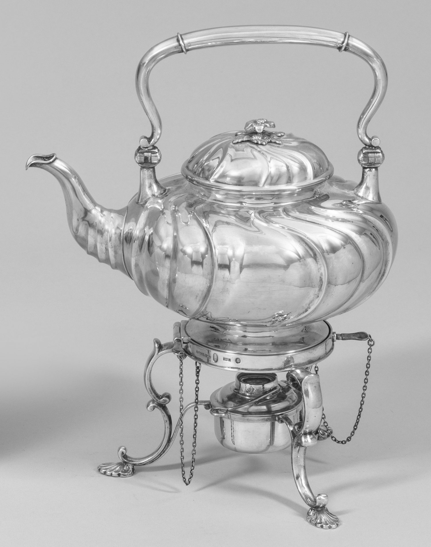 A silver Copenhagen tea kettle on a spirit warmer by A. Michelsen. City, assay and maker´s mark.