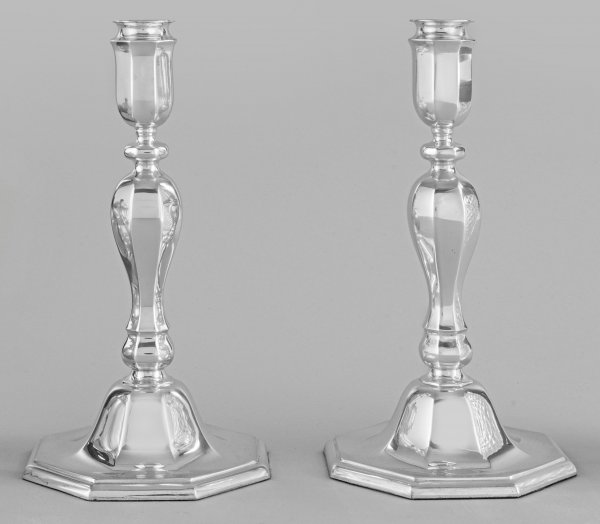 Paar Bremer Tafelleuchter Silber. Beschwert. Über achtfach facettiertem, trompetenförmig hochgezogenem Stand ein mehrfach durch geschweifte Züge im Barockstil gegliederter Balusterschaft. Übergehend in eine zylindrische Tülle mit leicht ausgestelltem Lippenrand. Gest. 835, Herstellerzeichen. H. 26 cm.
