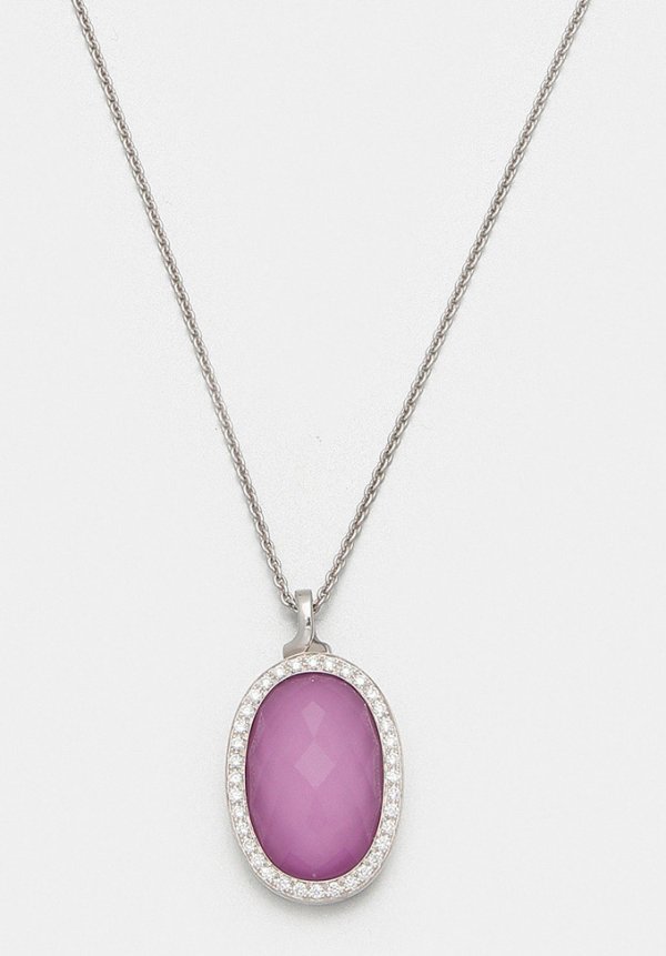 Anhänger mit Kette von Meissen "My little Mystery" Weißgold, gest. 750. Ovaler Anhänger mit fliederfarbenem Bergkristall im Briolettschliff auf fliederfarbenem Porzellan-Medaillon, entouriert von kleinen Brillanten von zus. ca. 0,28 ct. (F-G/vvsi). Herstellerzeichen. Ref.-Nr. M6647. Ges.-Gew. ca. 9,82 g. Sehr feine Erbsenkette.
