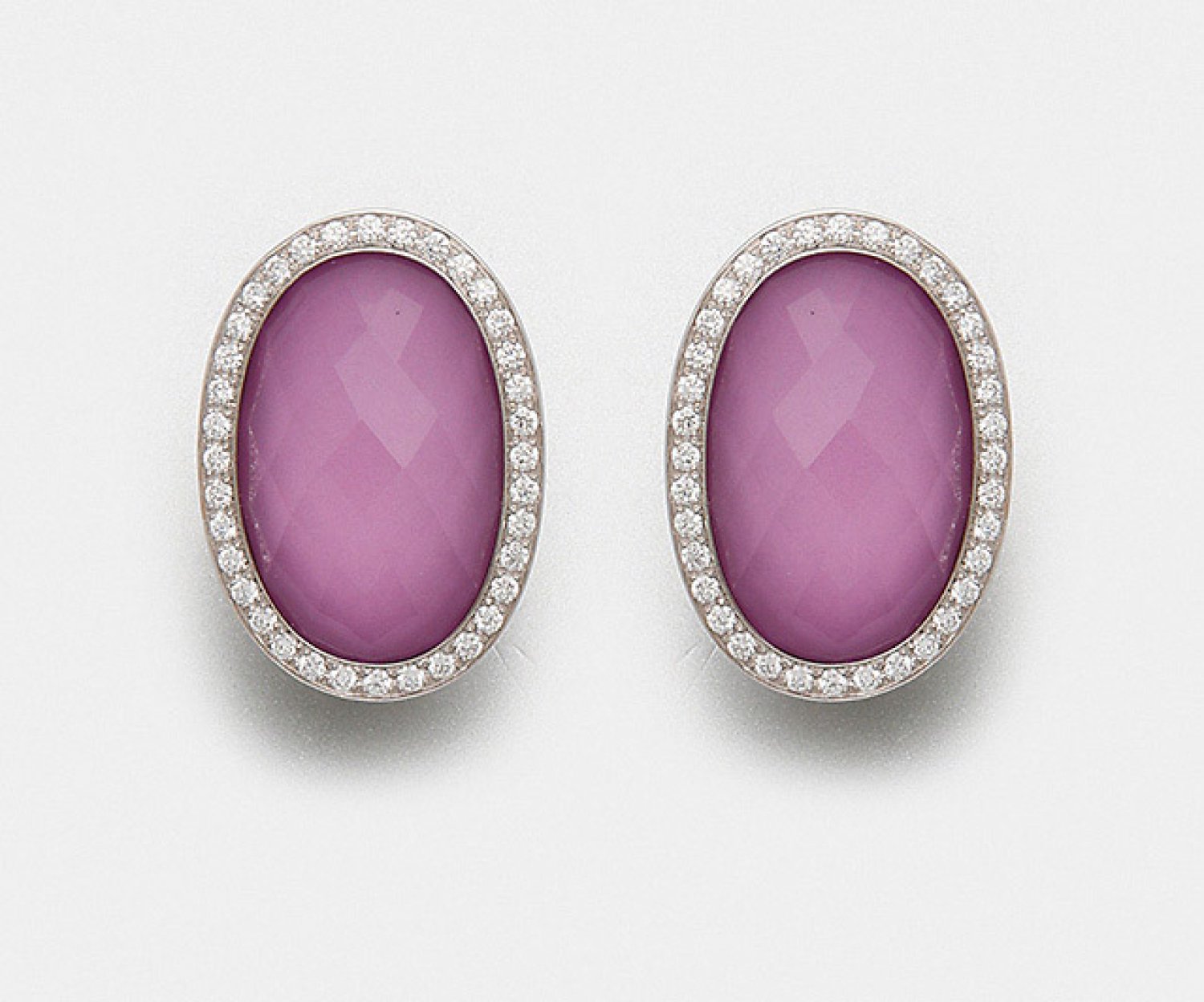 Paar Ohrclips von Meissen-"My little Mystery" Weißgold, gest. 750. Schauseitig besetzt mit Bergkristall im Briolettschliff auf fliederfarbenem Porzellan-Medaillon, entouriert von kleinen Brillanten von zus. ca. 0,57 ct. (F-G/vvsi). Herstellerzeichen. Ref.-Nr. M6667. Ges.-Gew. ca. 18,52 g.