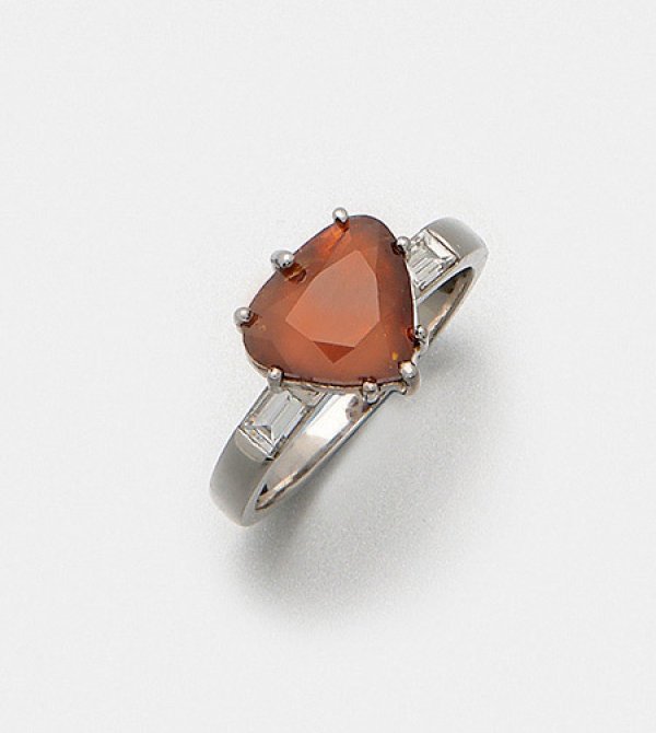 Natural Fancy-Orange-Diamantring Platin, gest. 950. Zentral besetzt mit einem Fancy-Deep-Orangy-Brown-Diamanten im Pearcut von ca. 3,24 ct., flankiert von Diamantbaguetten von zus. ca. 0,40 ct. (F-G/vvs). Gew. ca. 6,16 g.