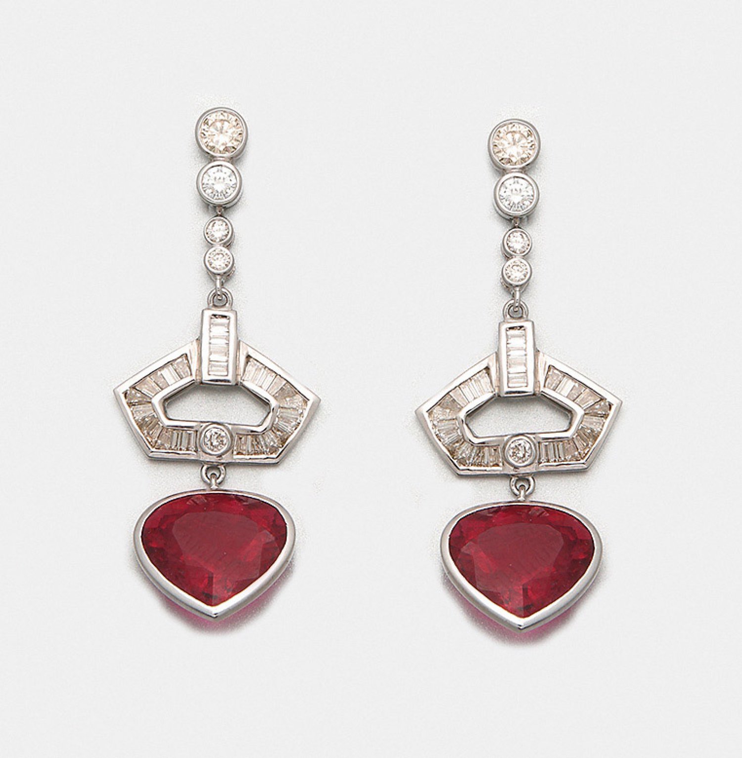 Paar Turmalin-Chandeliers von Buchwald, Frankfurt Weißgold, gest. 750. Schauseitig ausgefasst mit Diamantbaguetten und -trapezen von zus. ca. 1,30 ct. (F-G/si), Brillanten von zus. ca. 0,74 ct. (F-G/si) und abschließend zwei pinkfarbene Turmalinherzen von zus. ca. 18 ct.; Herstellerzeichen. Ges.-Gew. ca. 9,29 g.