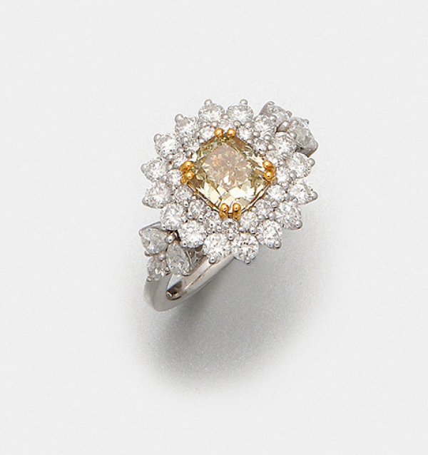 Feiner Natural Fancy-Diamantring Weißgold, gest. 750. Zentral besetzt mit einem Fancy-Brownish-Greenish-Yellow-Diamanten von ca. 1,59 ct. (si2), entouriert von Brillanten von zus. ca. 1,85 ct. (H-J/vs-si). Gew. ca. 5,67 g.