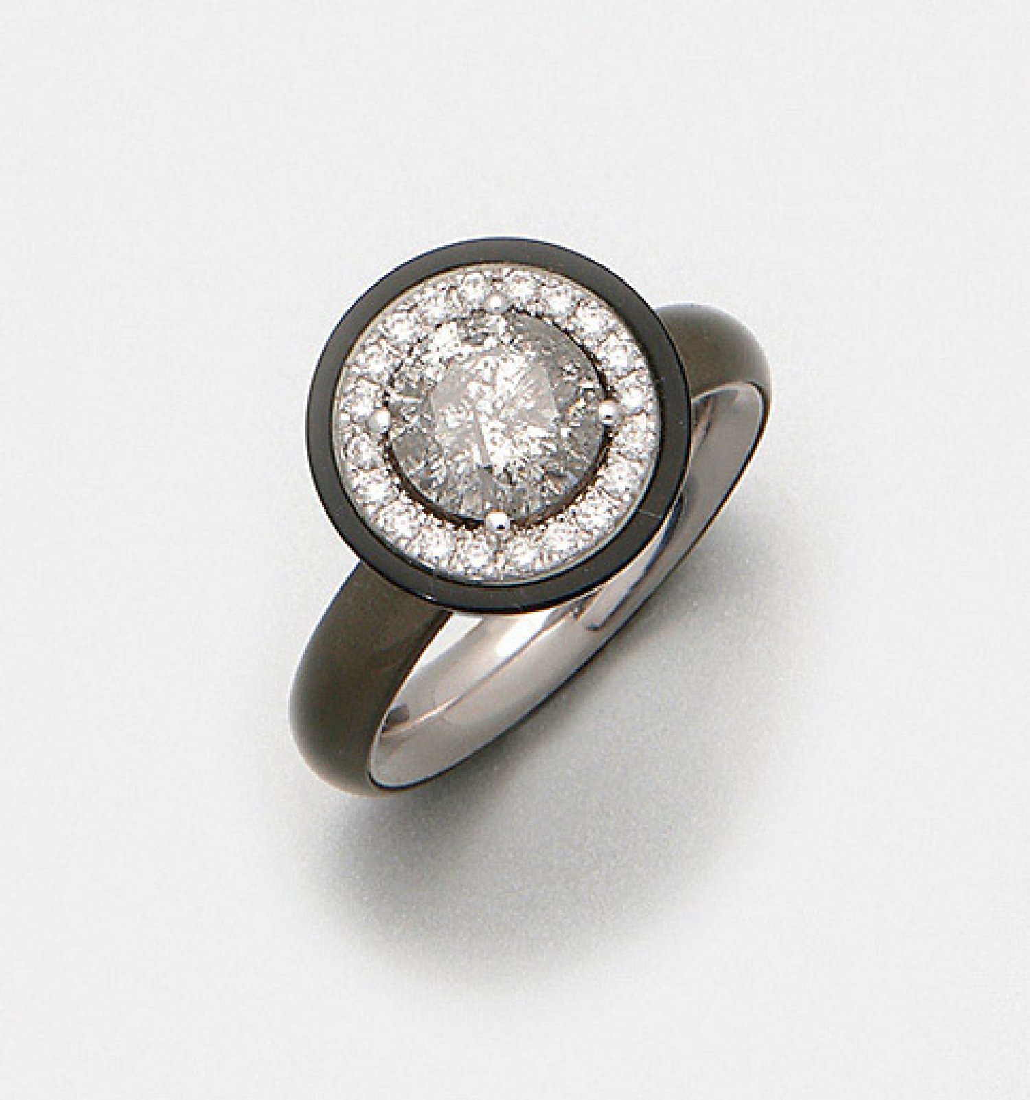 Brillant-Solitärring von Gellner "Gipsy Queen" aus der Kollektion "Brave". Weißgold und dunkelgrau-schwarzes Millenium Glas, gest. 750. Zentral besetzt mit einem grauen Brillantsolitär von ca. 2,06 ct. (pi), entouriert von kleinen Brillanten von zus. ca. 0,20 ct. (F-G/vsi). Ref.-Nr.5-21799-01.