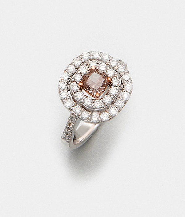Feiner Natural Fancy-Diamantring Weißgold, gest. 750. Zentral besetzt mit einem Fancy-Pink-Brown-Diamanten von ca. 0,80 ct. im Cushioncut, entouriert von kleinen Brillanten von zus. ca. 0,50 ct. (K-M/si). Gew. ca. 5,59 g.