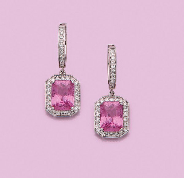 Paar Natural-Pink-Saphir-Ohrgehänge Weißgold, gest. 750. Jeweils besetzt mit einem unbehandelten pinkfarbenen Saphir von zus. ca. 3,55 ct. im Scherenschliff, entouriert von Diamanten von zus. ca. 0,37 ct.; Ges.-Gew. ca. 4,48 g.