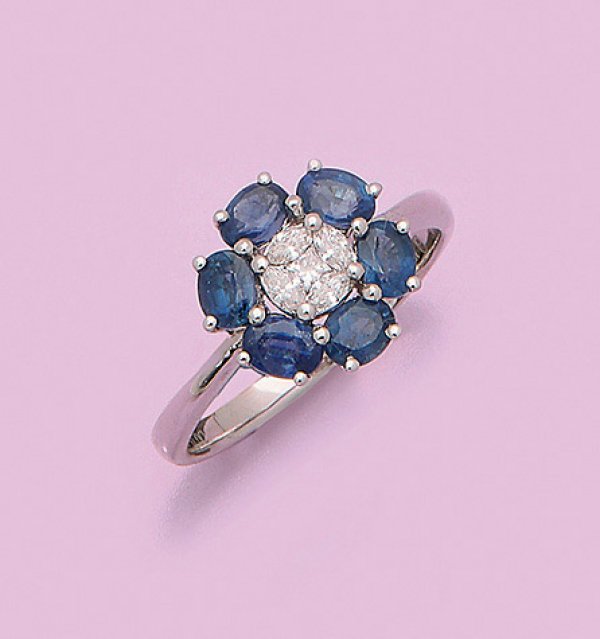 Feiner Saphir-Diamantring Weißgold, gest. 750. In blütenförmiger Anordnung besetzt mit kornblumenblauen Saphiren von zus. ca. 1,60 ct. und Diamantnavetten bzw. Diamanten im Princesscut von zus. ca. 0,16 ct. (H/si). Gew. ca. 3,30 g.