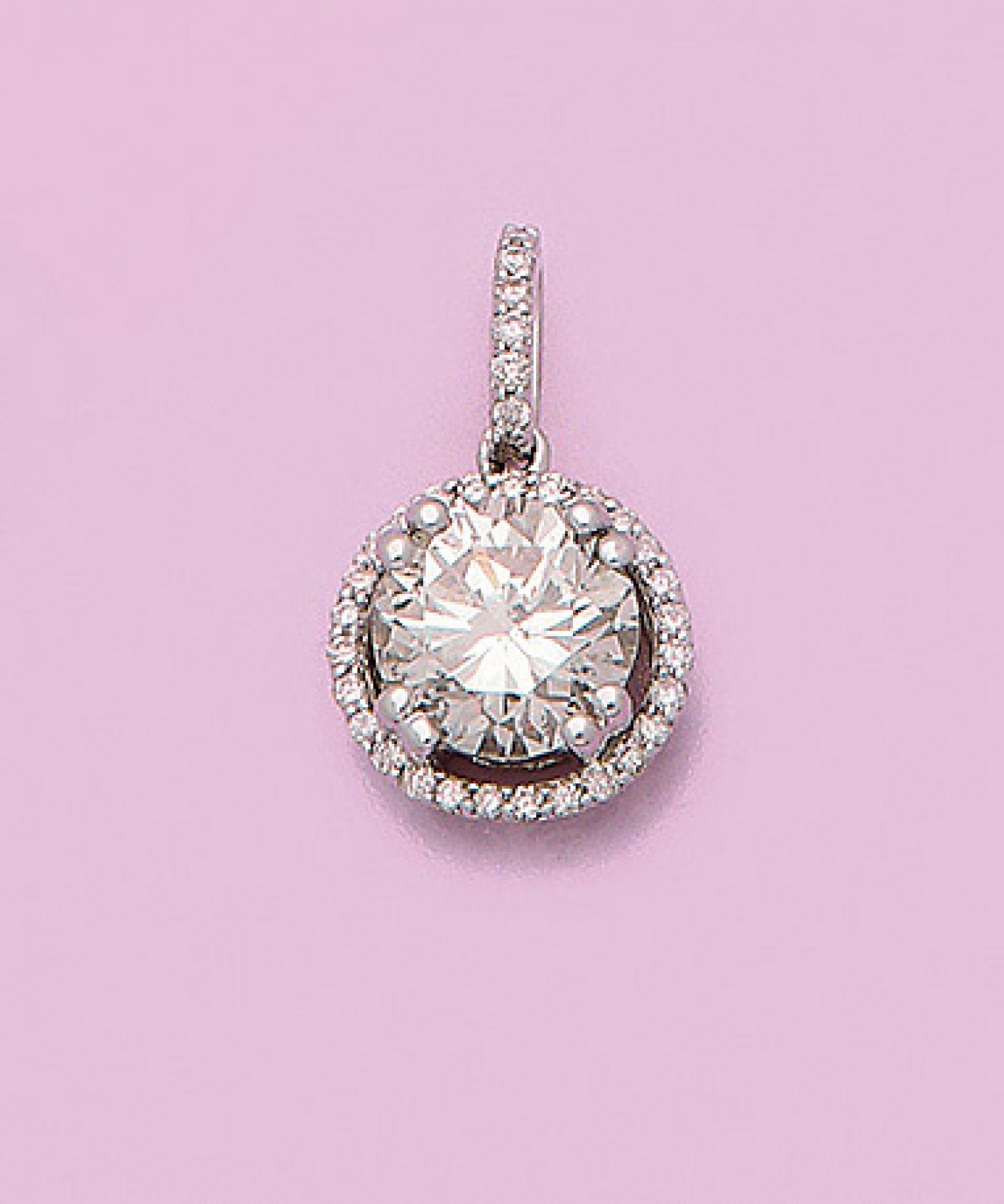 Klassischer Brillant-Solitäranhänger Weißgold, gest. 14 ct.; Zentral besetzt mit einem Brillanten von ca. 1,40 ct. (M/si), entouriert von kleinen Diamanten von zus. ca. 0,30 ct.; Gew. ca. 1,61 g.