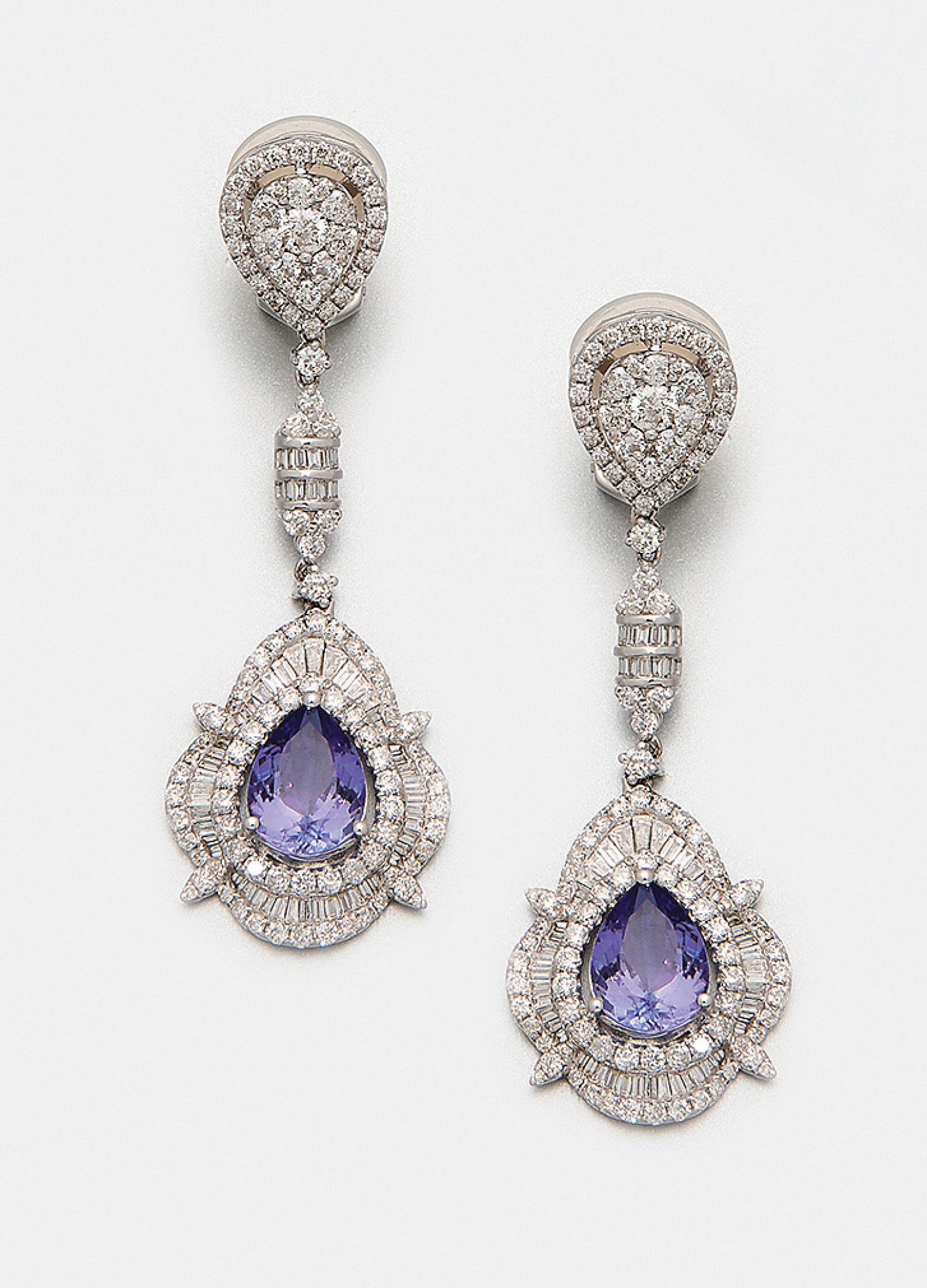 Paar exquisite Tansanit-Diamant-Ohrgehänge Weißgold, gest. 750. Jeweils besetzt mit einem blauvioletten Tansanittropfen von zus. ca. 3,86 ct., ausgefasst mit Diamantbaguetten und Brillanten von zus. ca. 4,06 ct. (F/vvs). Sehr feine Goldschmiedeausführung in Ajour. Ges.-Gew. ca. 11,69 g.