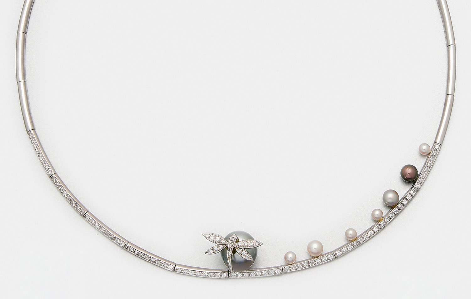 Feines Diamant-Perl-Collier Weißgold, gest. 18 ct.; Schauseitig besetzt mit Diamanten von zus. ca. 1,00 ct. (H/si) und kleinen weißen sowie anthrazitfarbenen Perlen und einer hellgrauen Tahiti-Perle in sehr feinem rosé-grün changierendem Lüster. Gew. ca. 18,08 g.