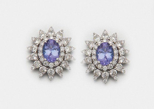 Paar repräsentative Tansanit-Brillantohrringe Weißgold, gest. 750. Zentral besetzt mit einem blauvioletten Tansanit von zus. ca. 2,53 ct., entouriert von Brillanten von zus. ca. 2,68 ct. (F-H/vsi). Ges.-Gew. ca. 6,71 g.