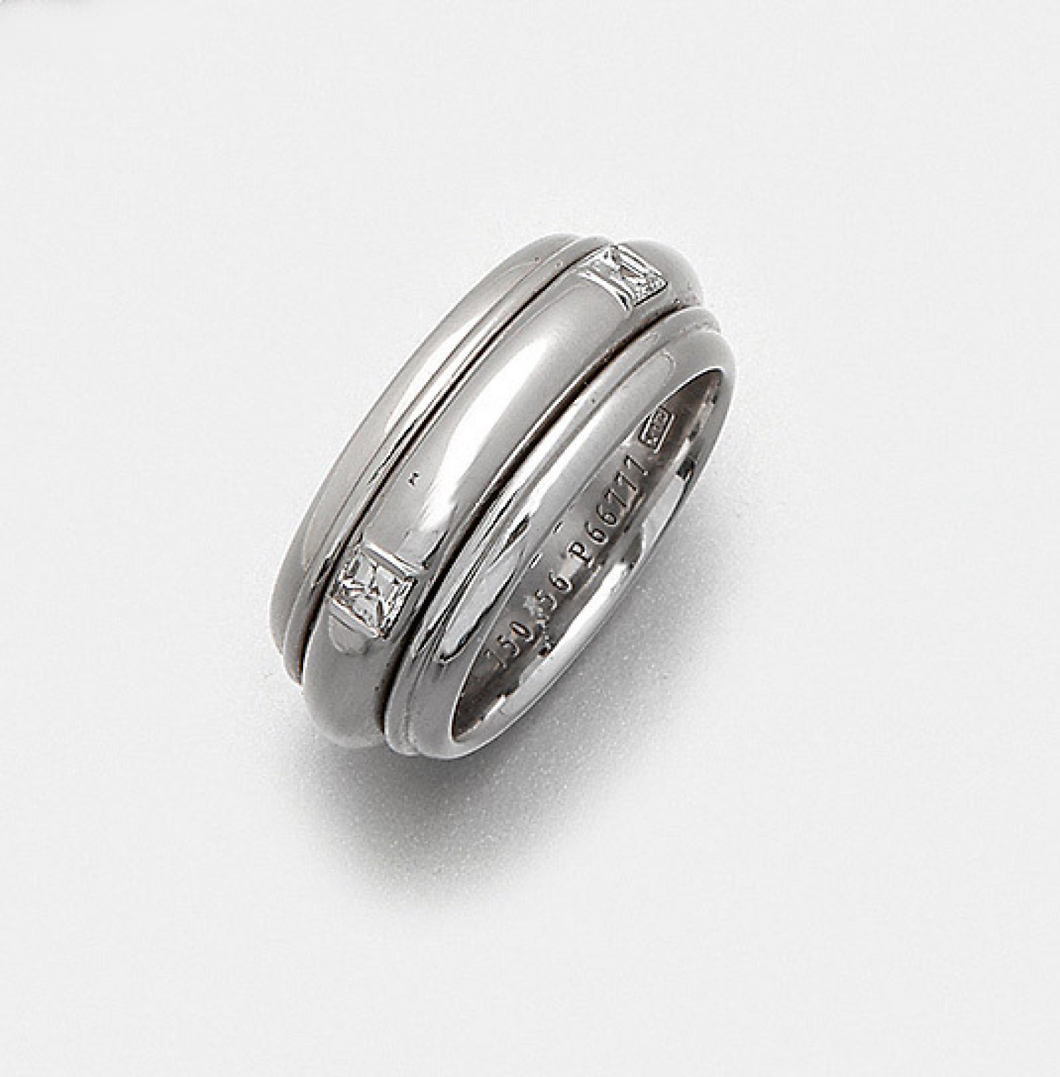 Brillant-Bandring-"Possession" von PIAGET Weißgold, gest. 750. Mittig profilierte, drehbare Ringschiene besetzt mit Diamanten im Princesscut von zus. ca. 0,59 ct. (F-G/vvs). Herstellerzeichen. Ref.-Nr. P66777. Gew. ca. 12,97 g.