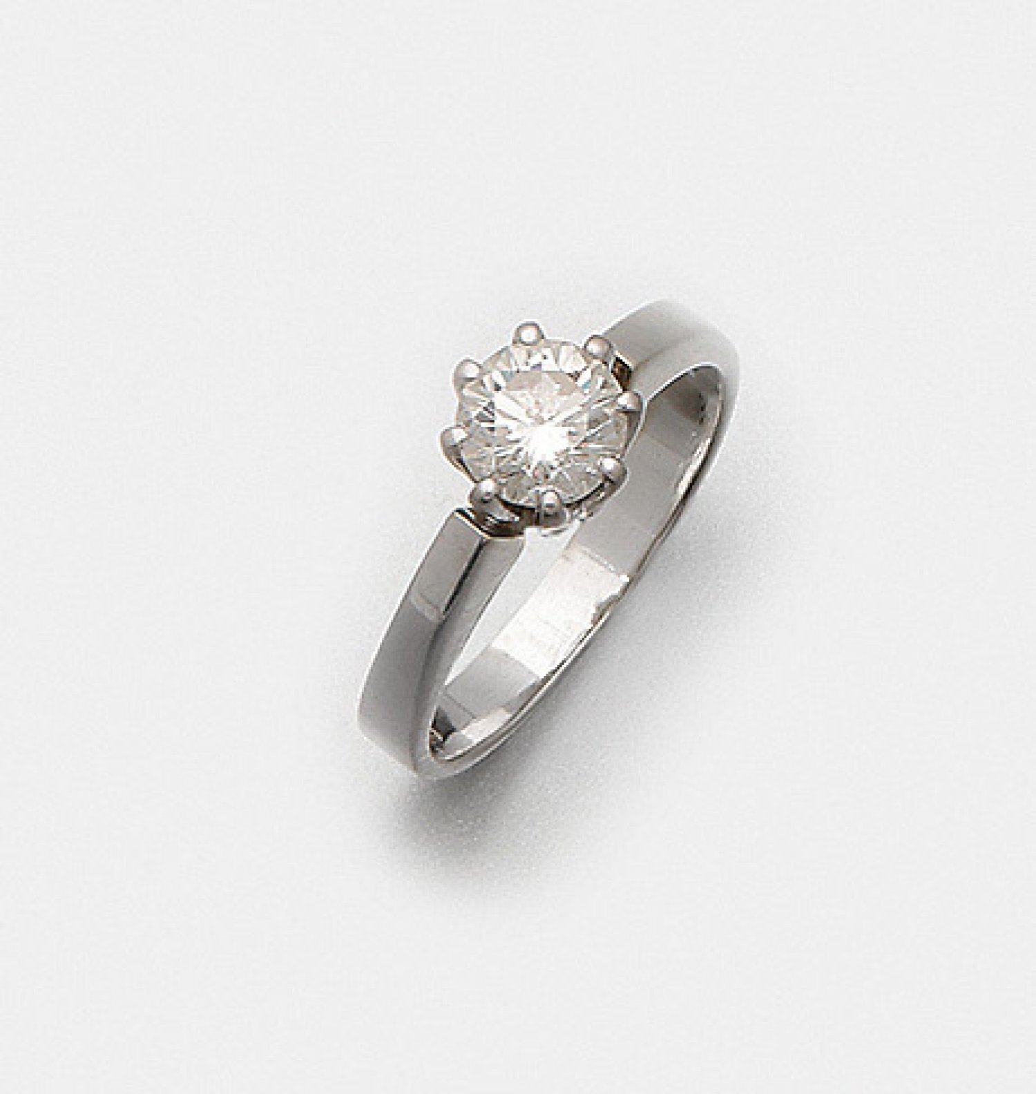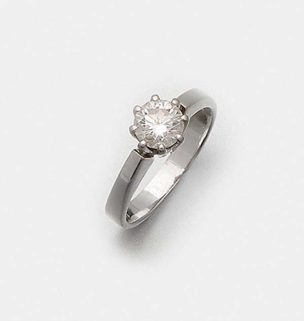 Klassischer Brillant-Solitärring Weißgold, gest. 750. Zentral besetzt mit einem Brillanten von ca. 0,88 ct. (J1/vs). Gew. ca. 4,56 g.