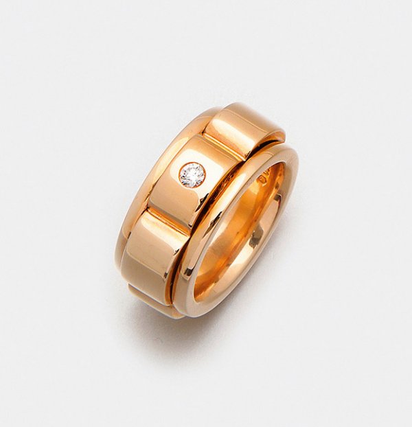 Bandring von A. Odenwald, Pforzheim Roségold, gest. 750. Sog. Ring im Ring. Mittig godronierte, drehbare Ringschiene, besetzt mit einem Brillanten von ca. 0,15 ct. (F-G/vvs). Herstellerzeichen. Gew. ca. 24,3 g.