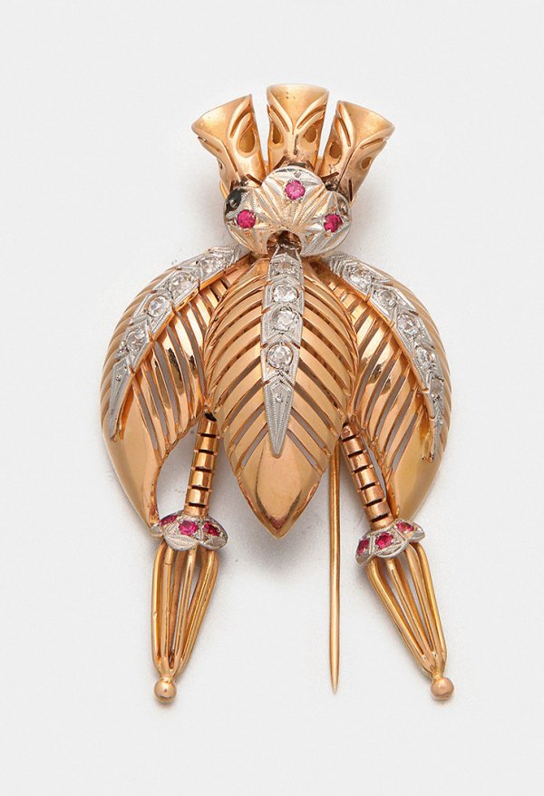 Mondäne Diamantbrosche aus den 40er Jahren Roségold, gest. 750. In Form einer Blüte in Ajour, besetzt mit Diamantrosen von zus. ca. 0,60 ct. und roten Farbsteinen. Gew. ca. 29,11 g.
