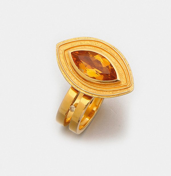 Extravaganter Citrinring von Katzler, Berlin Gelbgold, gest. 750. Zweireihige Ringschiene unterteilt durch einen Fancy Yellow Brillanten von ca. 0,05 ct., oberhalb besetzt mit einem goldgelben Citrin im Marquiseschliff von ca. 6,00 ct.; Herstellerzeichen. Gew. ca. 22,14 g.