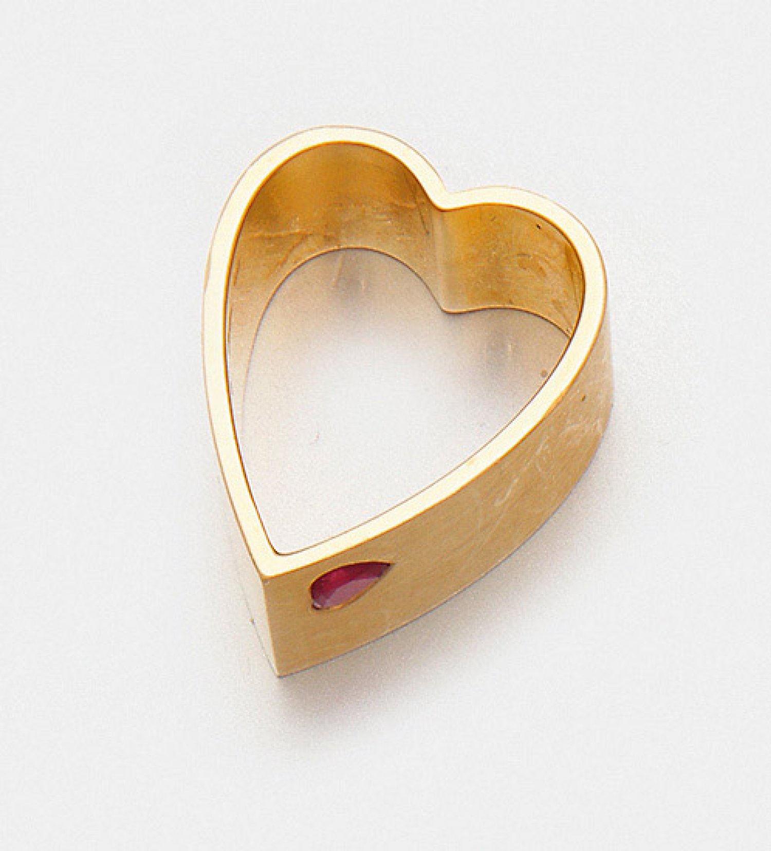 Extravaganter Herzring mit Rubin von Katzler, Berlin Gelbgold, gest. 750. Dekorativ gestaltete Herzform, schauseitig satiniert und besetzt mit einem taubenblutroten Rubin von ca. 0,38 ct. im korrespondierenden Schliff. Herstellerzeichen. Gew. 19,31 g.
