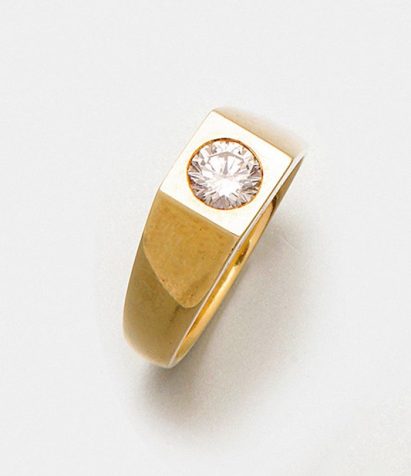 Herren-Bandring mit Brillantsolitär Gelbgold, 14 ct.; Zentral besetzt mit einem Brillanten von ca. 1,30 ct. (I-J/vs-si). Gew. ca. 16,60 g.