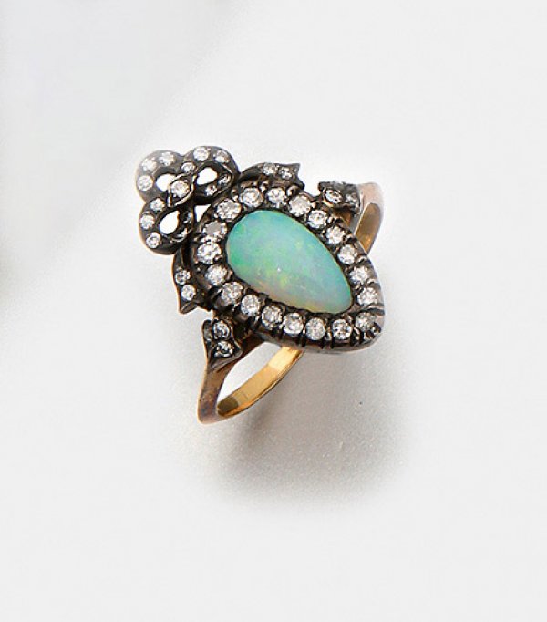 Viktorianischer Opalring Gelbgold, 18 ct., teilw. mit Silber verbödet. Medaillonförmiger Ringkopf mit Schleifenbekrönung, besetzt mit einem Opalcabochon von besonders schönem Farbspiel, entouriert von Altschliffdiamanten von ca. 0,50 ct.; Gew. ca. 3,38 g.