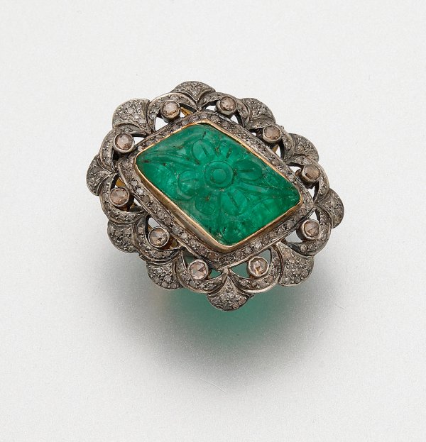 A Russian ring set with an emerald and antique diamonds approx. 2,00 ct., in 14 k gold and silver.