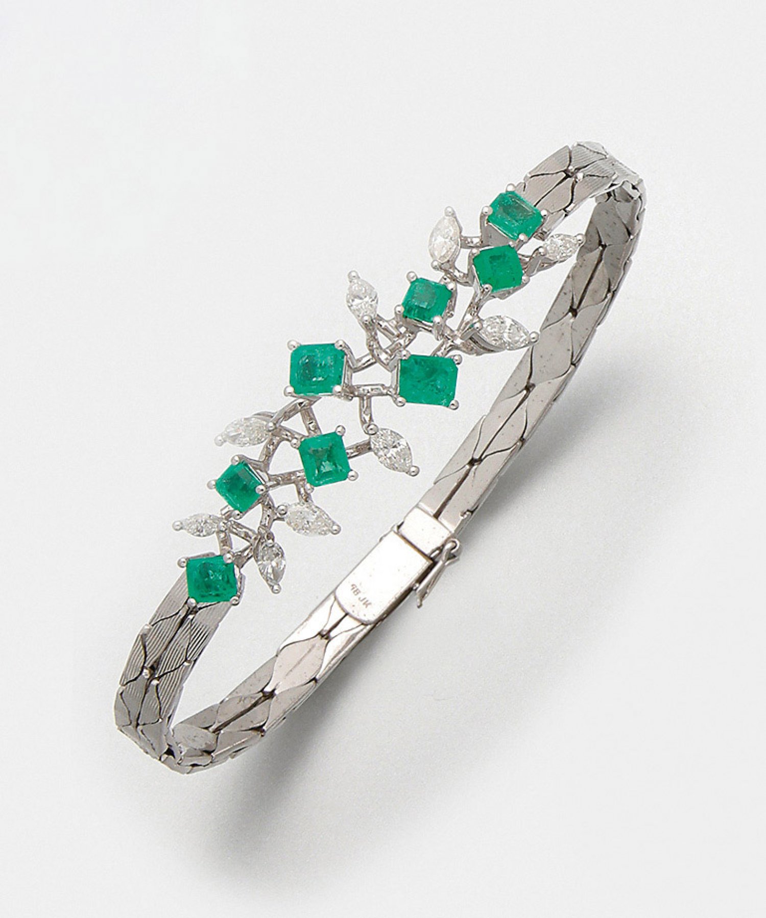 Kolumbianisches Smaragd-Armband Weißgold, gest. 18 ct.; Schauseitig besetzt mit leuchtendgrünen Smaragden von zus. ca. 2,80 ct. im Carreéschliff und Diamantnavetten von zus. ca. 0,75 ct. (G/si). Gew. ca. 19,12 g.