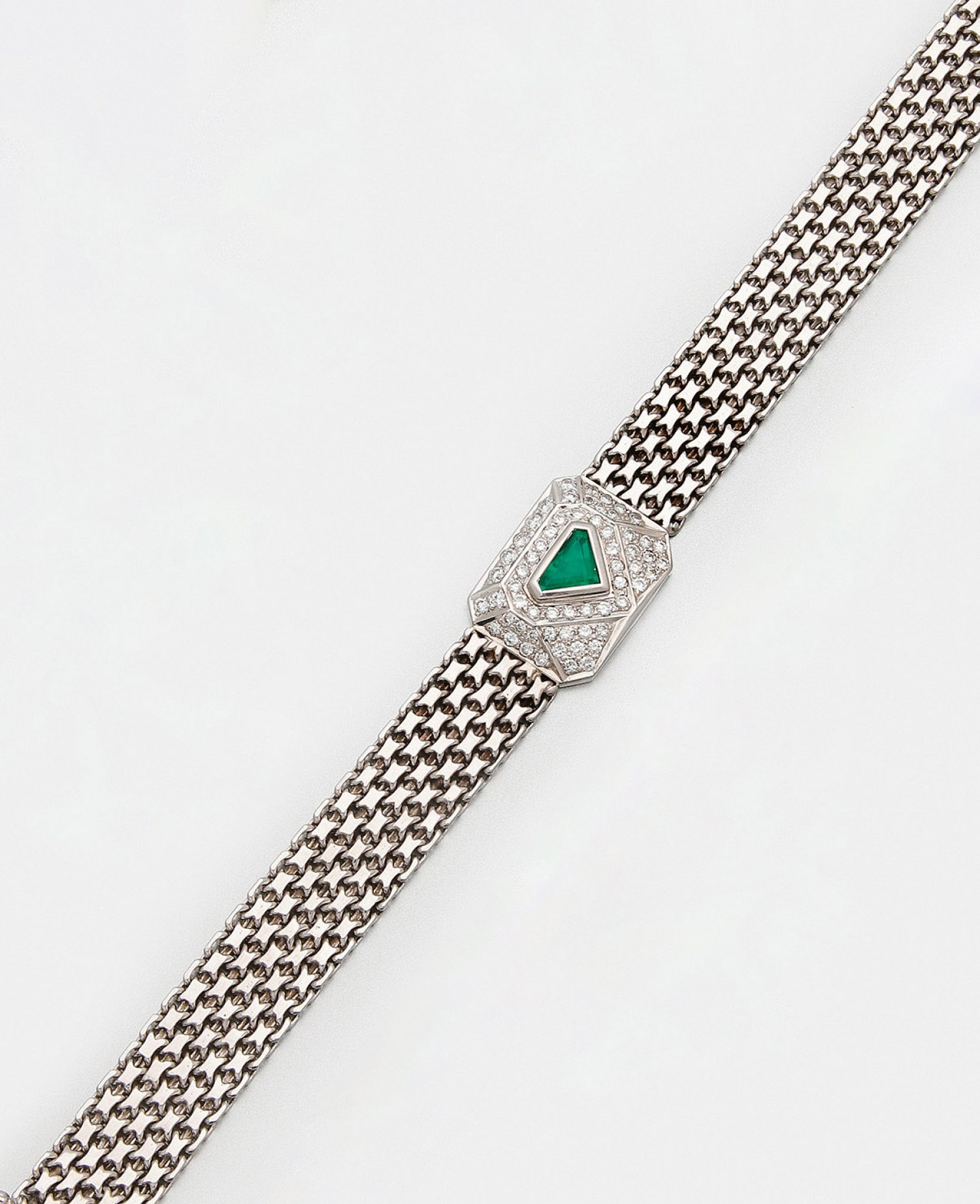 Elegantes Cocktail-Armband mit kolumbianischen Smaragd Weißgold, gest. 750. Zentral besetzt mit einem Smaragd im Triangelschliff von ca. 1,40 ct., umrahmt von diversen Brillanten von ca. 1,20 ct. (F-G/vs-si). Gew. ca. 37,86 g.
