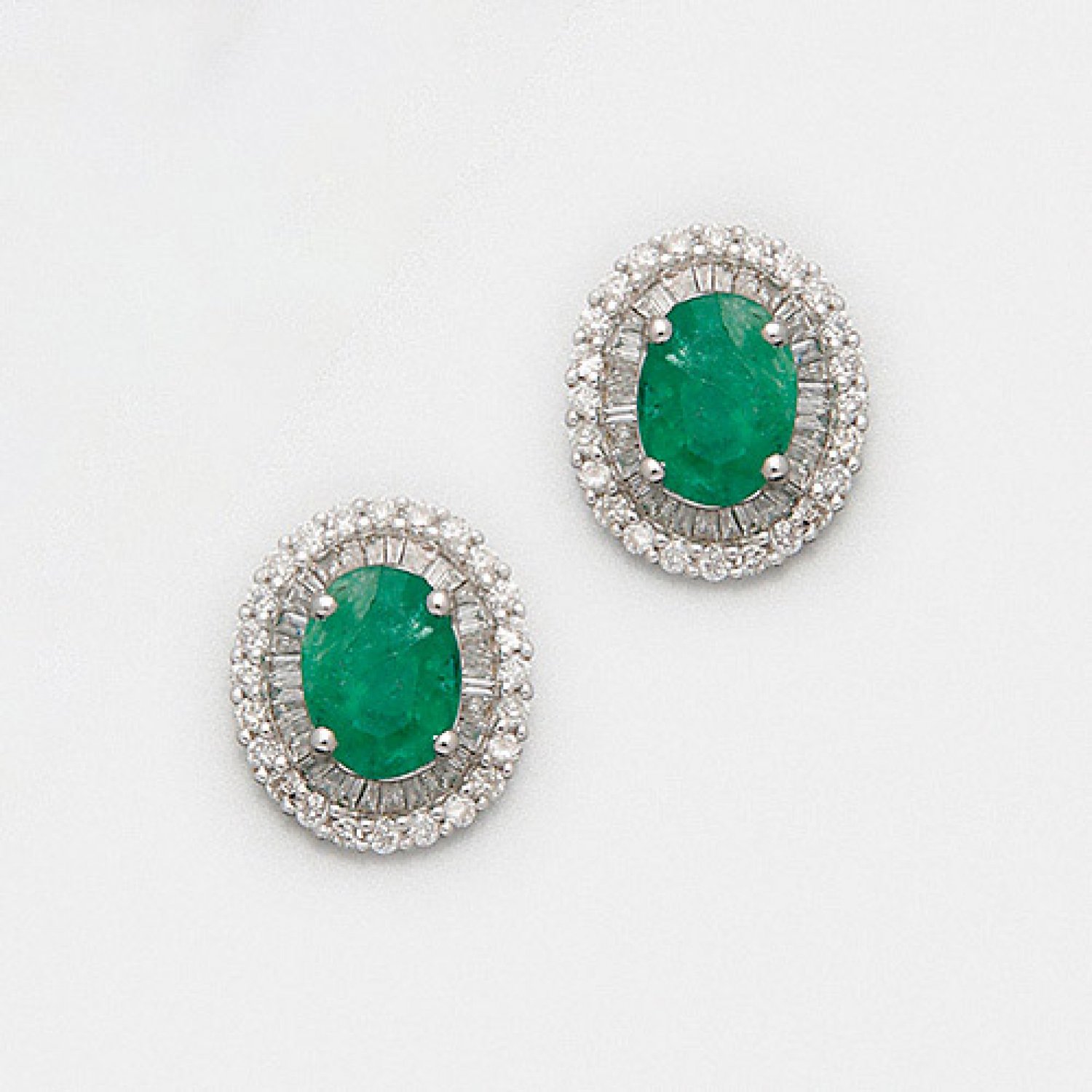 Paar klassische Sambia-Smaragd-Ohrringe Weißgold, gest. 750. Zentral besetzt mit jeweils einem leuchtendgrünen Smaragd von zus. ca. 1,76 ct., entouriert von Diamantenbaguetten und Brillanten von zus. ca. 0,84 ct. (H/vs). Ges.-Gew. ca. 3,96 g.