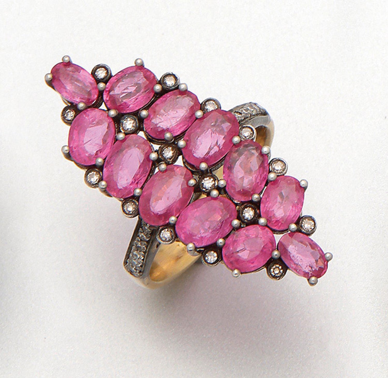 Russischer Marquise-Ring mit Rubinen Gelbgold, gest. 56 (583), teilw. mit Silber verbödet. Schauseitig ausgefasst mit pinkfarbenen Rubinen von zus. ca. 5,80 ct. und Diamanten von zus. ca. 0,30 ct.; Gew. ca. 6,69 g.