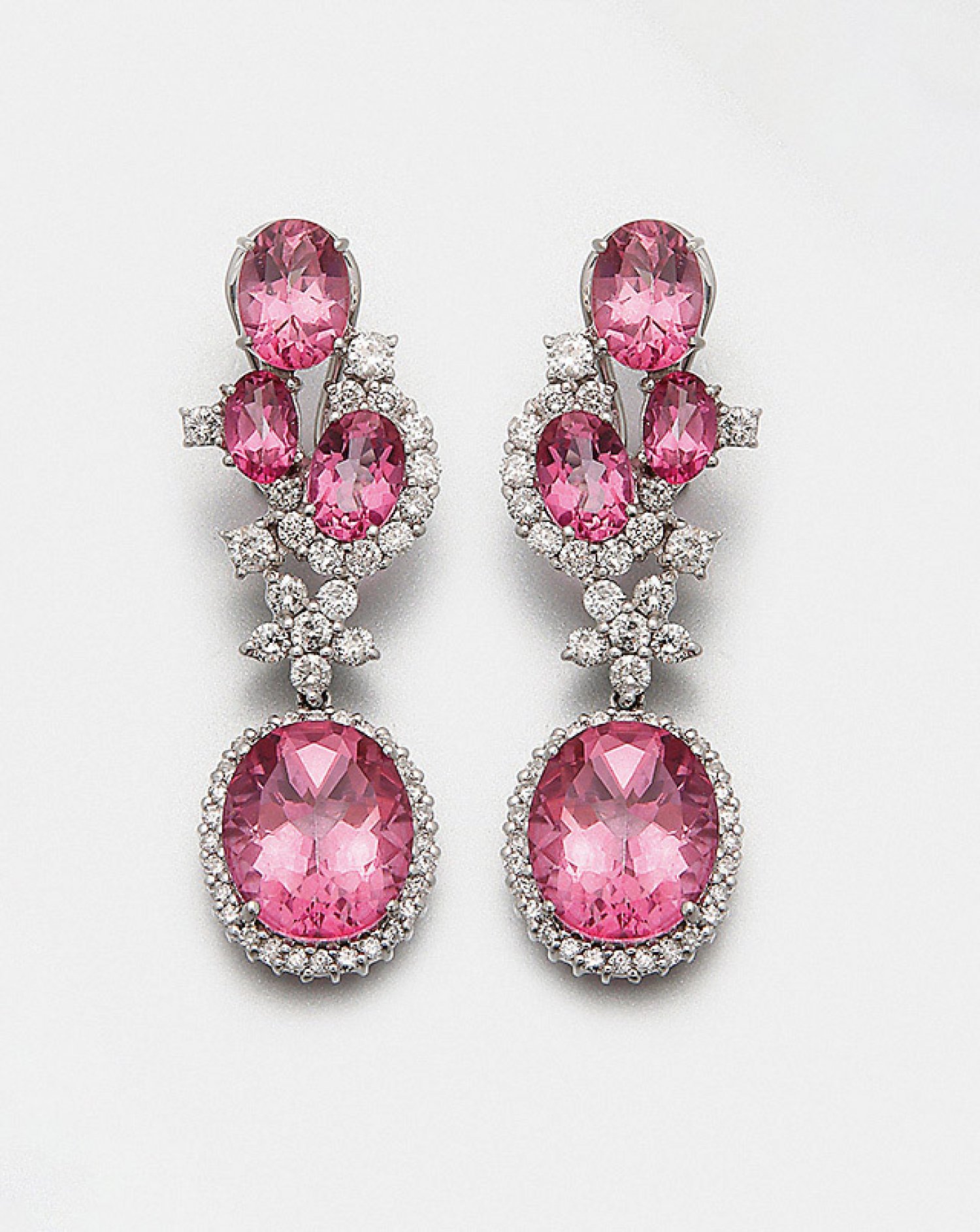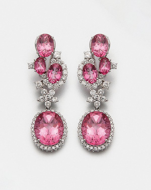 Paar glamouröse Topas-Ohrgehänge Weißgold, gest. 750. Schauseitig ausgefasst mit pinkfarbenen Topasen im Ovalschliff von zus. ca. 12,00 ct. und Brillanten von zus. ca. 1,60 ct. (H-J/si-pi). Ges.-Gew. ca. 13,36 g.