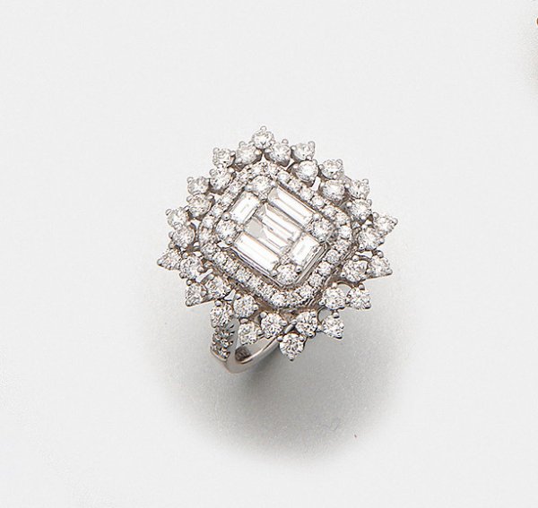 Repräsentativer Diamantring Weißgold, gest. 750. Schauseitig besetzt mit Diamanten im Baguette- und Brillantschliff von zus. ca. 2,00 ct. (G-H/vvs). Gew. ca. 5,99 g.