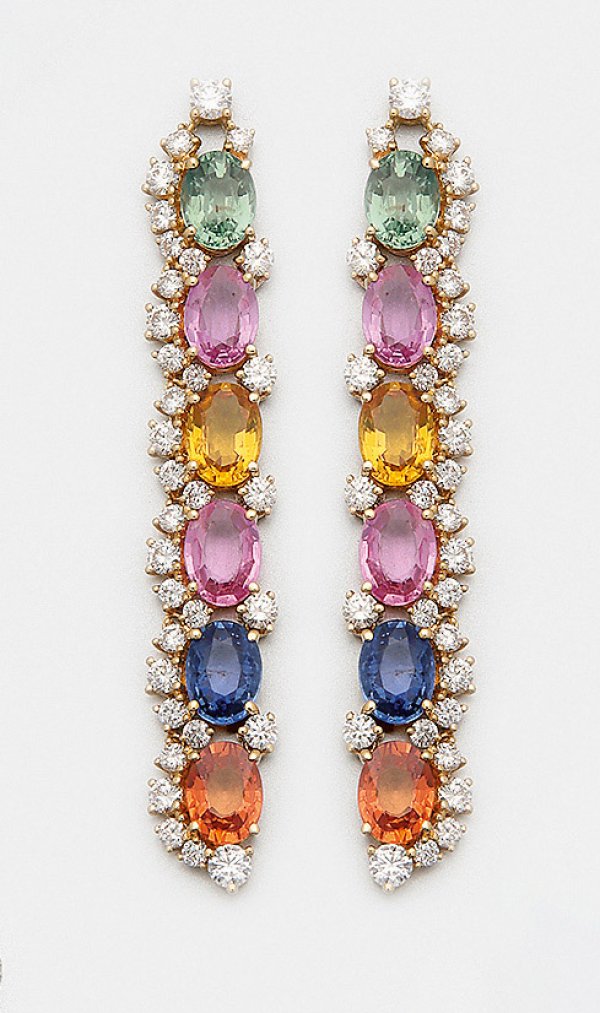 Farbenprächtige Saphir-Ohrgehänge Weißgold, gest. 750. Schauseitig besetzt mit gelben, pinkfarbenen, olivgrünen, kornblumenblauen und gelben Saphiren von zus. ca. 10,90 ct., akzentuiert durch Diamanten von zus. ca. 2,60 ct. (H/vs1). Ges.-Gew. ca. 10,52 g.