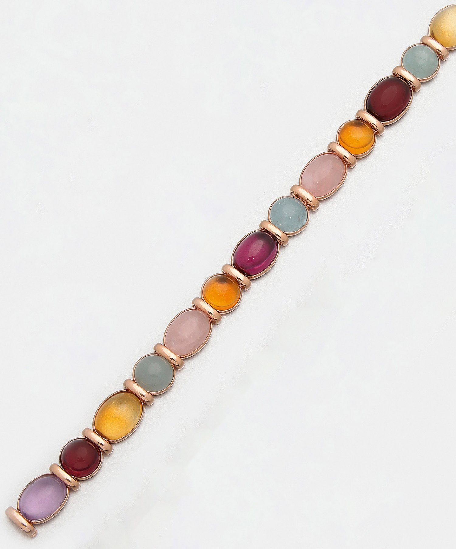 Multicolor-Designer-Armband Roségold, gest. 750. Schauseitig besetzt mit fliederfarbenen Amethysten, zartrosafarbenen Rosenquartzen, goldgelben- und limonenfarbenen Citrinen, himbeerfarbenen Rhodolithen und eisblauen Aquamarinen von zus. ca. 72,30 ct. im Cabochonschliff. Hersteller-Monogramm H.S.; Gew. ca.30,54 g.