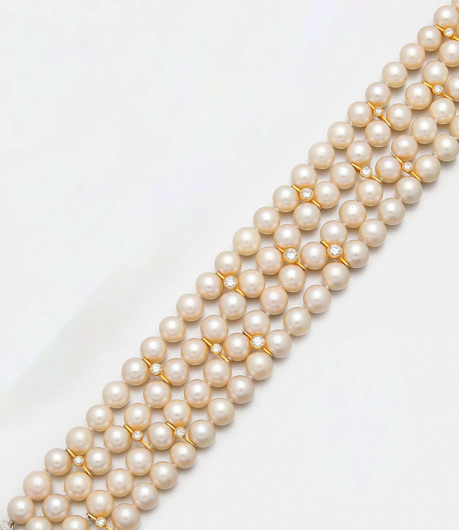 Repräsentatives Perl-Brillantarmband Silber, teilw. Gelbgold 14 ct.; Vierreihiges Armband aus cremefarbenen Zuchtperlen von ca. 7 mm in sehr feinem rosé-grün changierendem Lüster. Akzentuiert durch Brillanten von zus. ca. 1,00 ct. (F-G/vvs).
