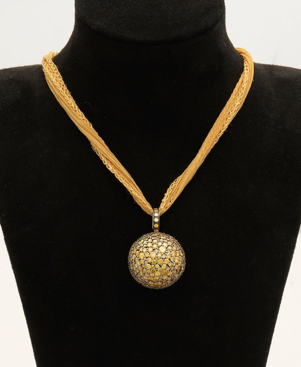 Fancy-Brillant-Kugelanhänger von Michael Weggenmann Weißgold, anthrazitfarben rhodiniert, gest. 750. Allseitig besetzt mit Yellow-Greenish Brillanten von zus. ca. 10,45 ct. in Pavéfassung. Herstellerzeichen. Gew. ca. 17,90 g.