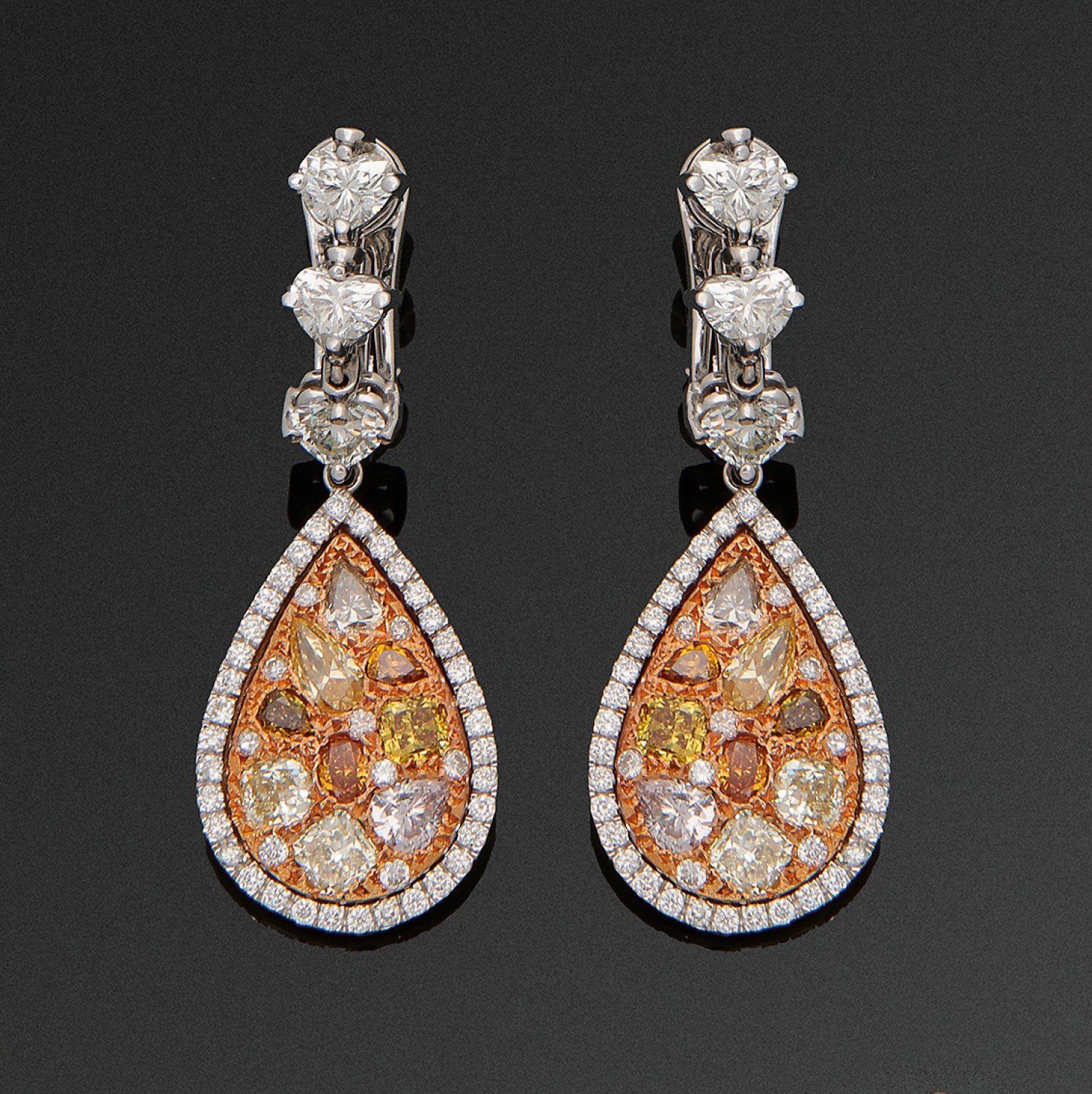 Paar Multicolor Fancy-Diamantohrgehänge Weißgold, gest. 18 ct.; Schauseitig besetzt mit Brillanten und Diamanten im Herzschliff von zus. ca. 2,04 ct. (G-H/vs) und Natural Fancy-Yellow-Pink-Brown und Pink-Diamanten von zus. ca. 3,06 ct. (vs). Ges.-Gew. ca. 13,11 g.