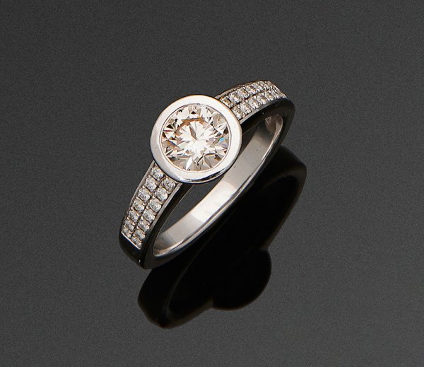 Eleganter Brillant-Solitärring Weißgold, gest. 750. Zentral besetzt mit einem Brillanten von ca. 1,03 ct. (top crystal(I)/if (lupenrein)-vvs), in schlichter Zargenfassung, flankiert von Brillanten von zus. ca. 0,50 ct. (top wesselton(F-G)/vvs).