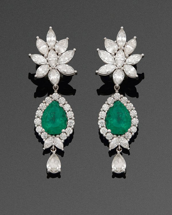 A pair of earrings set with two emeralds approx. 6,54 ct. and numerous diamonds approx. 8,82 ct. (D-F/vvs-vs), in 18 k white gold. Certificates included.