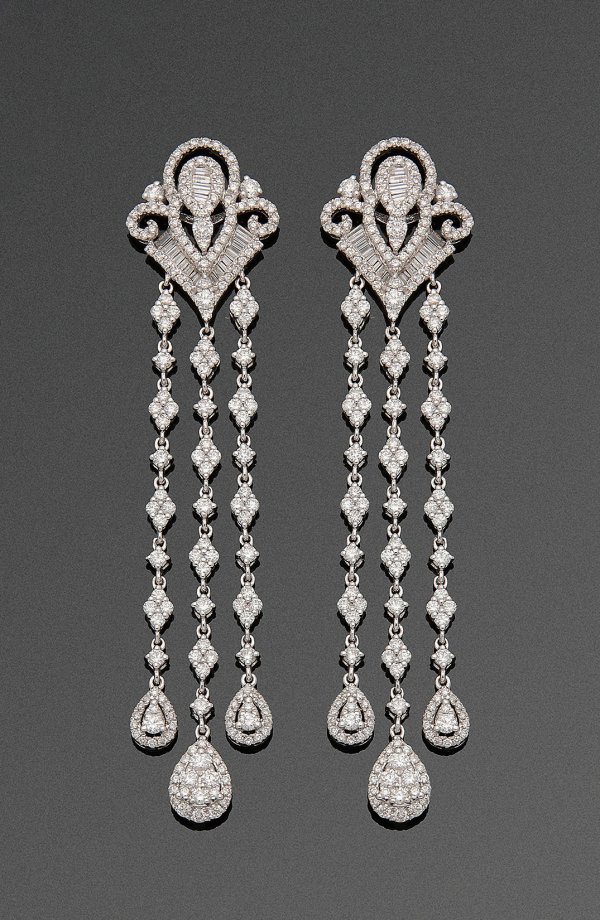 Paar hochfeine Diamant-Chandeliers Weißgold, gest. 750. Schauseitig ausgefasst mit Brillanten und Diamantnavetten von zus. ca. 4,08 ct. (G-H/vvs). Sehr feine Goldschmiedeausführung im Stil von Van Cleef & Arpels. Ges.-Gew. ca. 13,74 g.