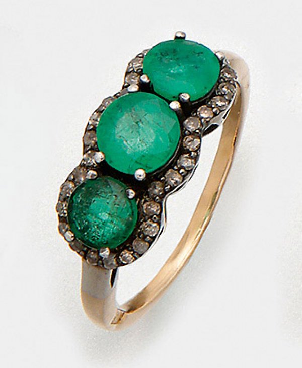 Russischer Smaragdring Gelbgold, gest. 56 (583) und Silber. Besetzt mit drei leuchtendgrünen Smaragden von zus. ca. 1,50 ct., akzentuiert durch kleine Diamanten. Gew. 3,11 g.