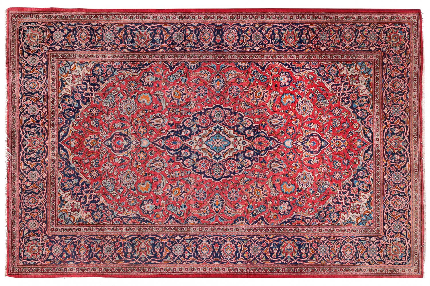 Alte Keschan-Brücke Persien. Mitte 20. Jh.; Korkwolle auf Baumwolle. Im roten Innenfeld gestrecktes, dunkelblaues Zentralmedaillon mit Anhängern sowie breite Ecklösungen. Flächendeckende Musterung aus Palmettenranken. Umlaufend breite Hauptbordüre aus Palmettenranken, flankiert von schmalen Nebenbordüren. 213 cm x 140 cm.