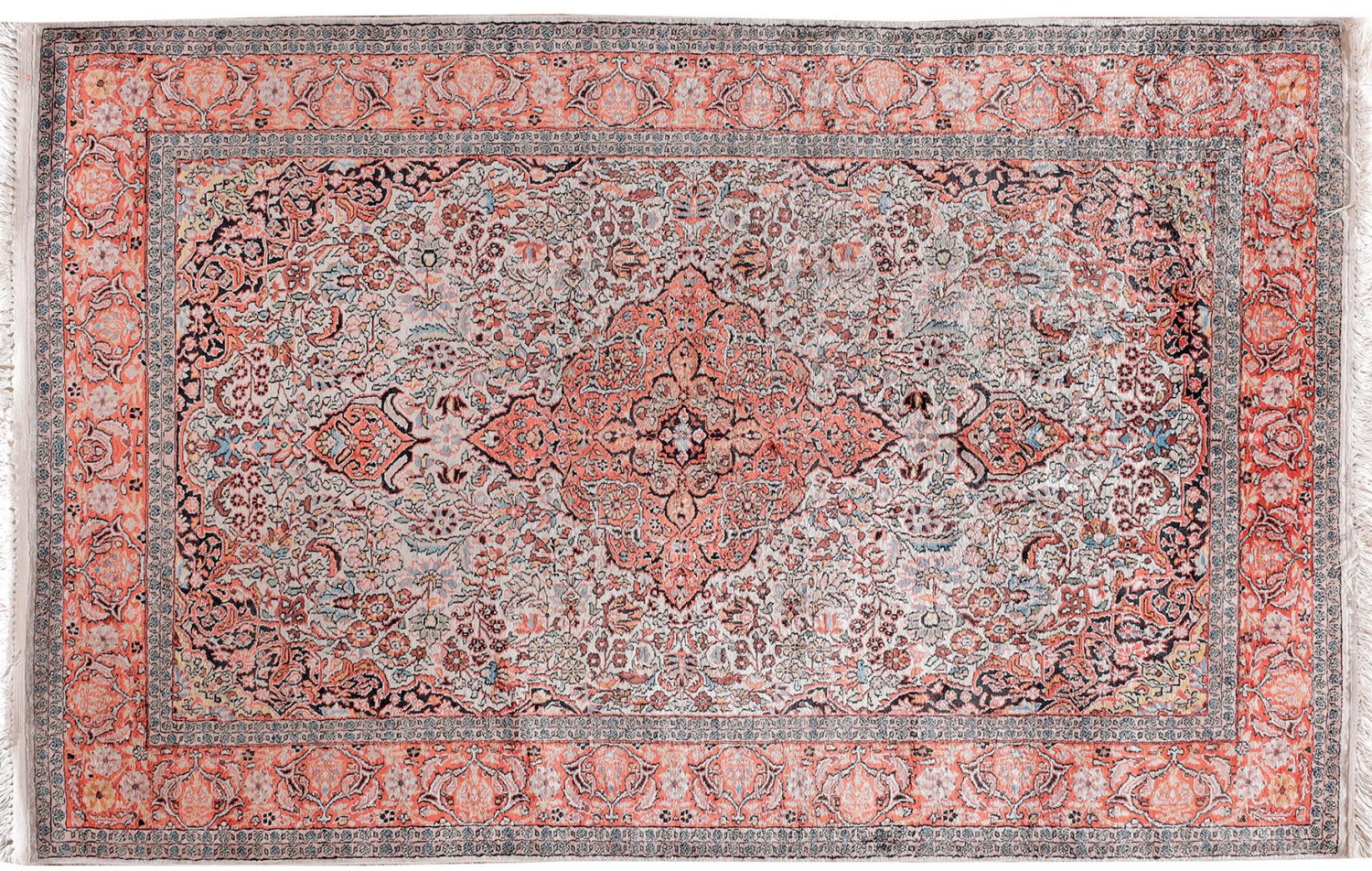 Kaschmir-Brücke Indien. Mercerisierte Baumwolle auf Baumwolle. Im elfenbeinfarbenen Innenfeld großes, roséfarbenes Zentralmedaillon mit Anhängern sowie dunkelblaue Ecklösungen. Flächendeckend dichte Blütenmusterung sowie umlaufend korrespondierende Palmettenbordüre. 206 cm x 125 cm.