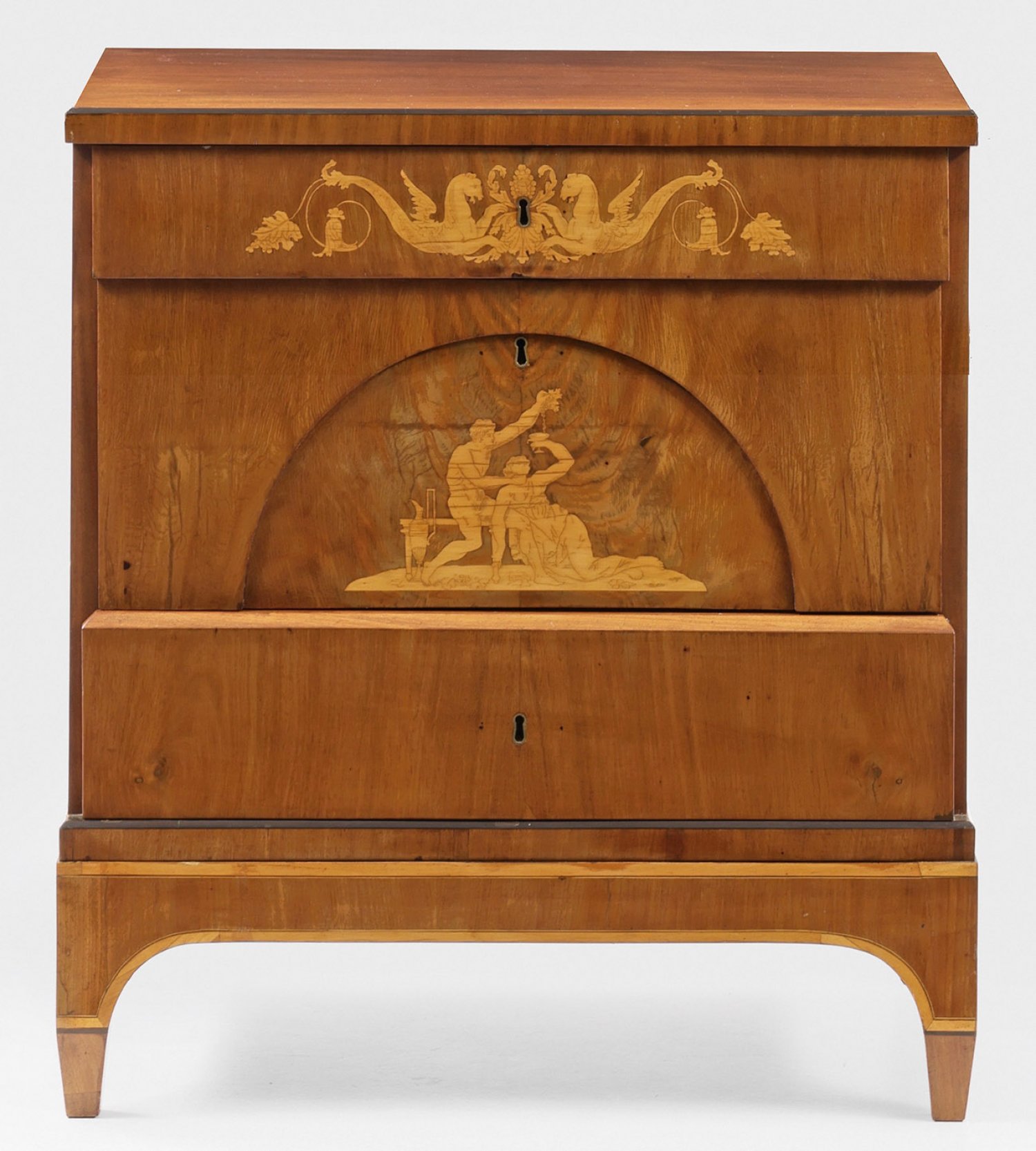 Kleine Empire-Kommode Mahagoni, furniert sowie Einlagen aus Ahorn. Gerader, rechteckiger Korpus auf leicht vorkragendem, segmentähnlich ausgespartem Zargensockel und konischen Füßen. In der gegliederten Front drei Schubladen unterschiedlicher Größe sowie Segmentbogen mit figürlichen Einlagen eines Bacchantenpaares. Oberhalb gegeneinander gestellte Chimären. Gering überstehende Deckplatte. H. 81,5 cm. 74 cm x 47 cm.