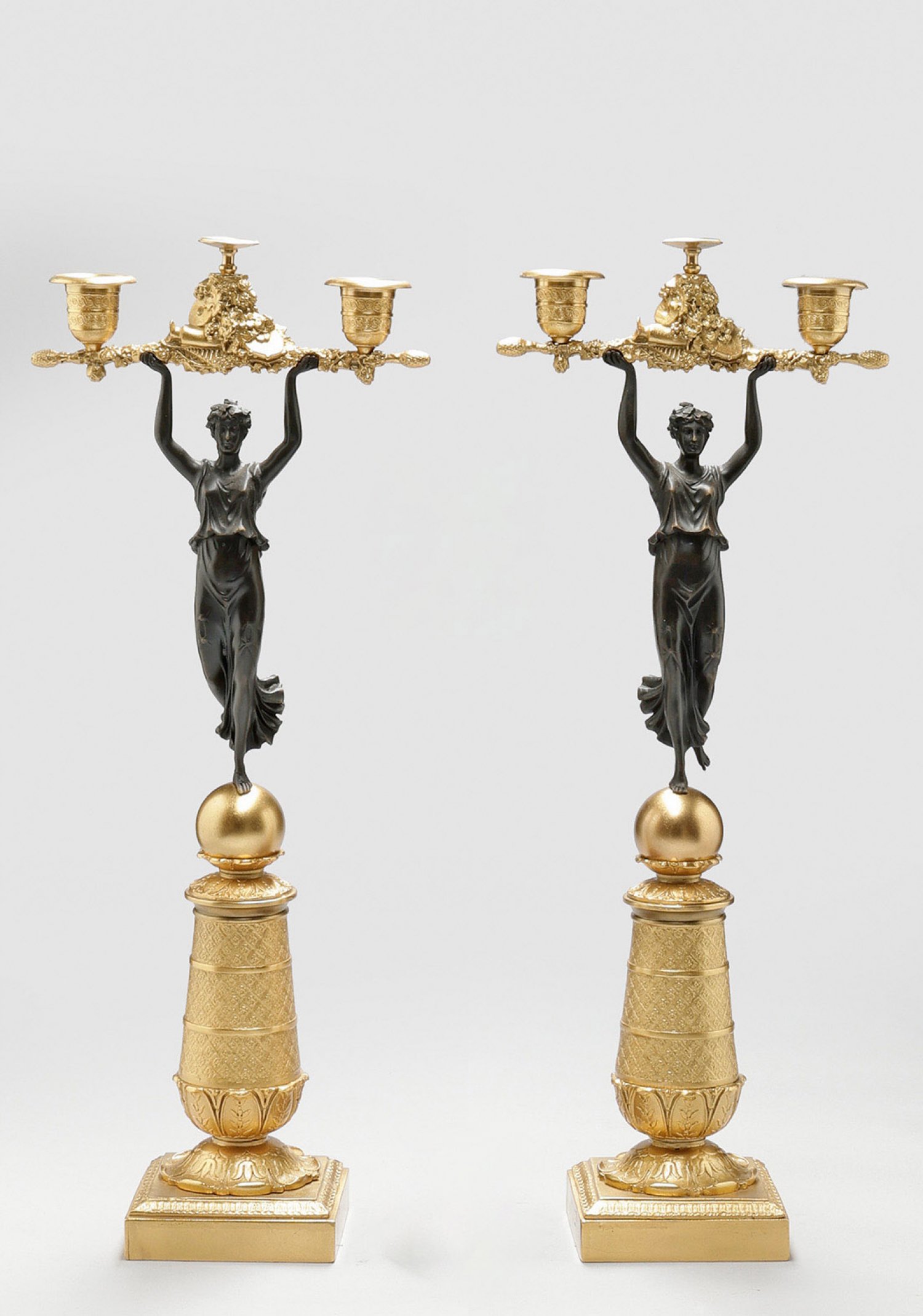 Paar Girandolen im Empire-Stil 2-flg.; Bronze, dunkel patiniert bzw. vergoldet. Über quadratischem Sockel mit Palmettenfries mehrfach gegliederter, umlaufend reliefierter Schaft mit Kugelelement. Oberhalb vollplastische Darstellung einer antikisierenden Dame als Träger für Leuchtmittel mit vasenförmigen Tüllen. H. 46,5 cm.